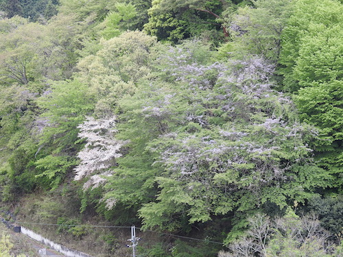 MFの林道の里山で婚姻色のダイサギ。桐、藤、山桜、ウワミズザクラ。